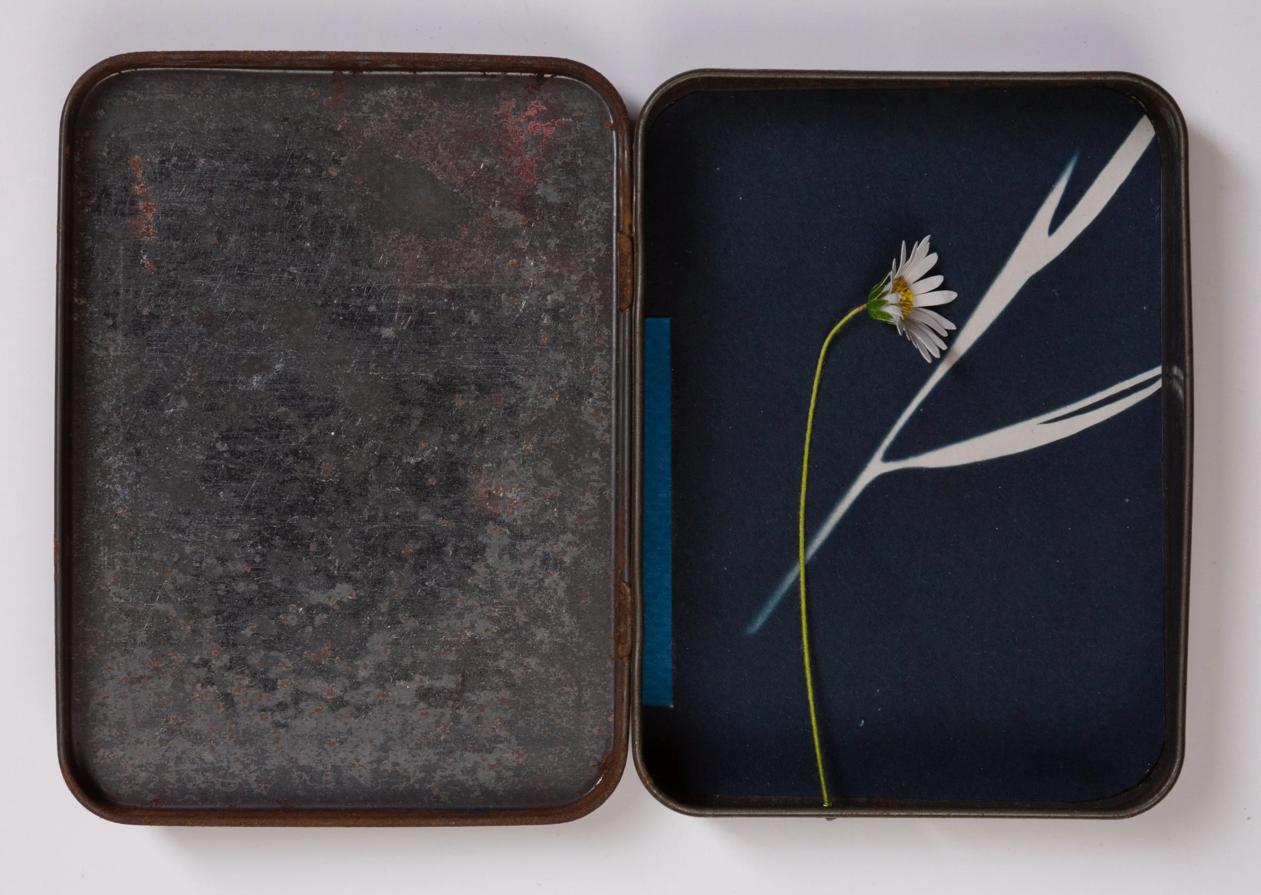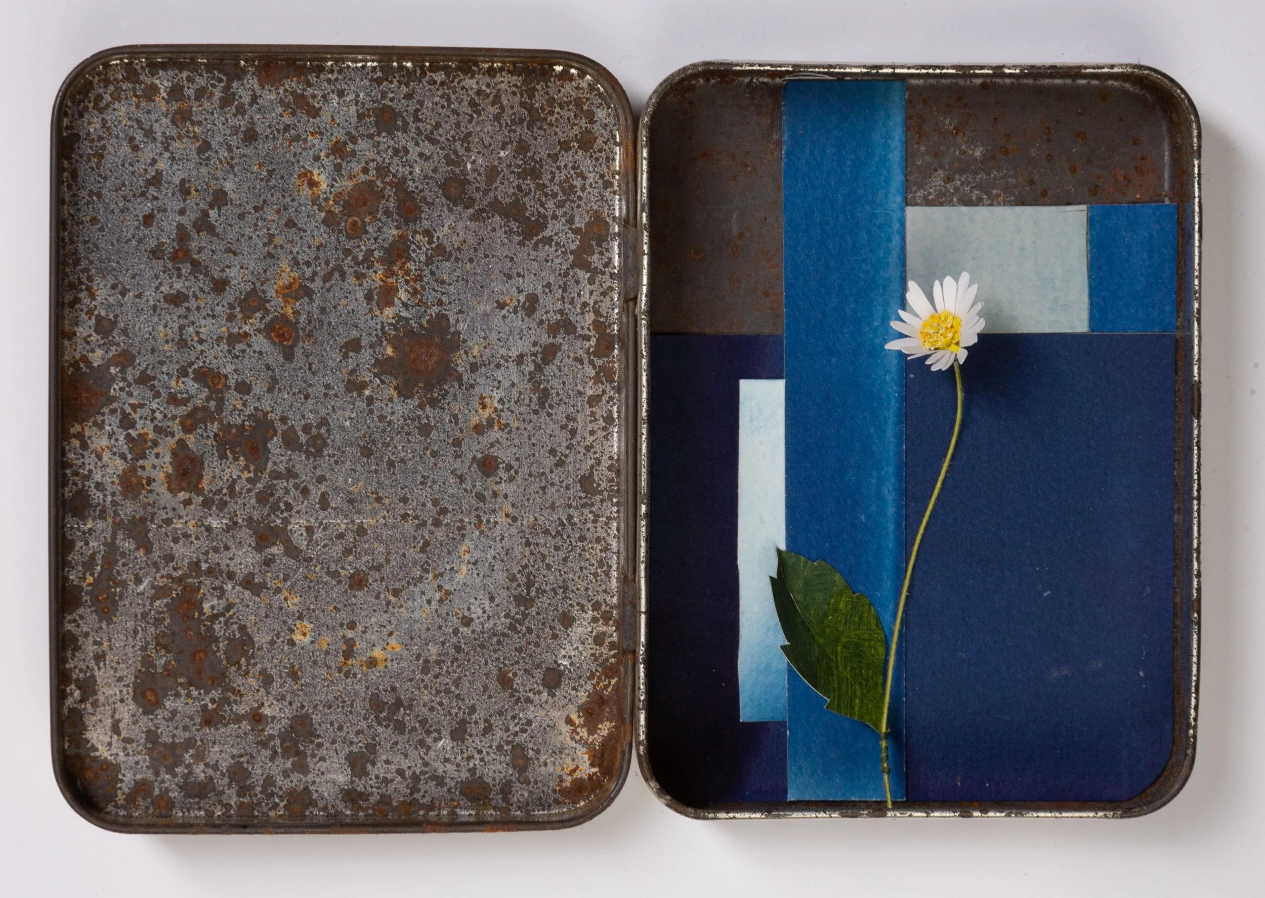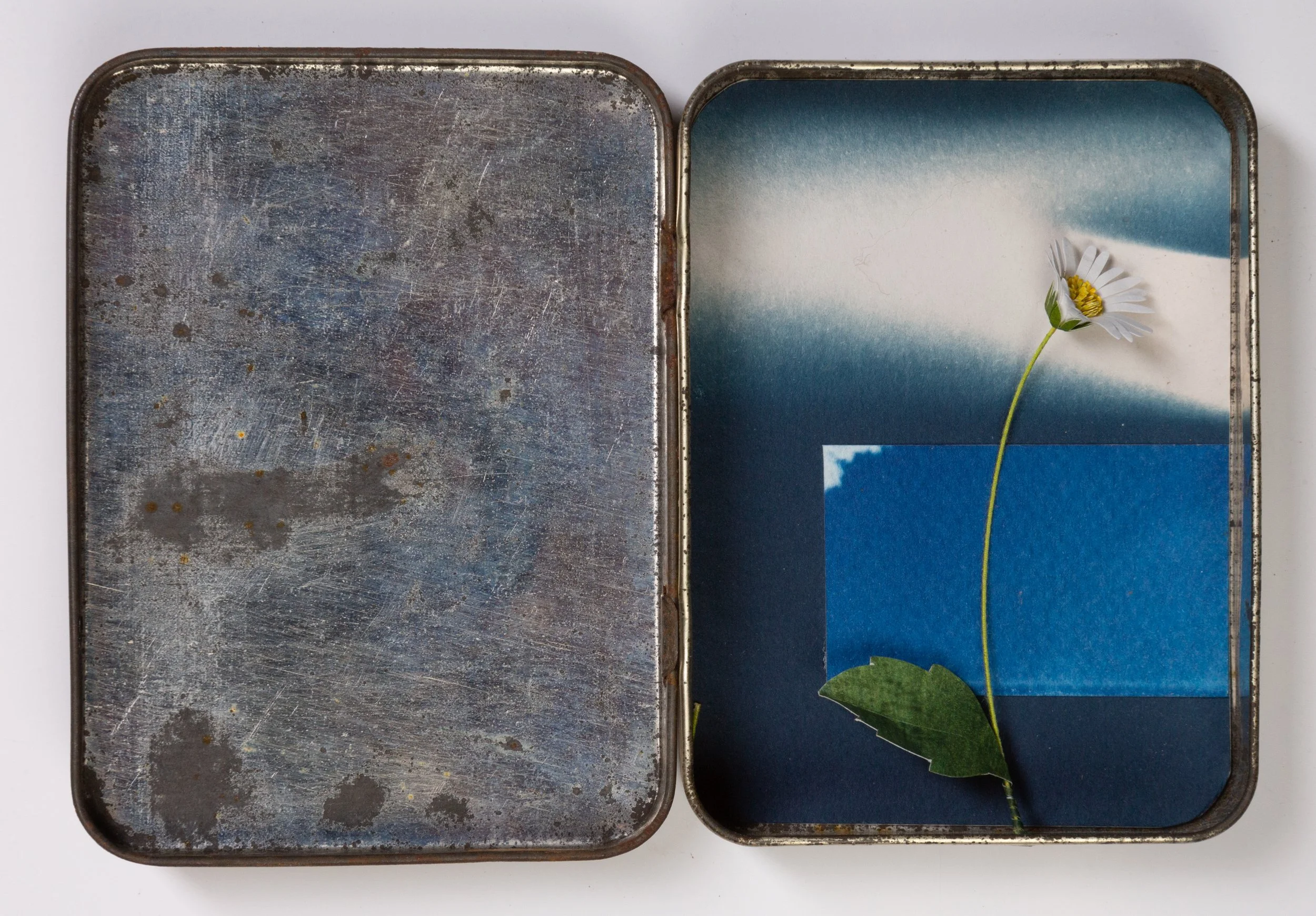 Materials: paper, wire, cyanotype collage and hinged tobacco tin.