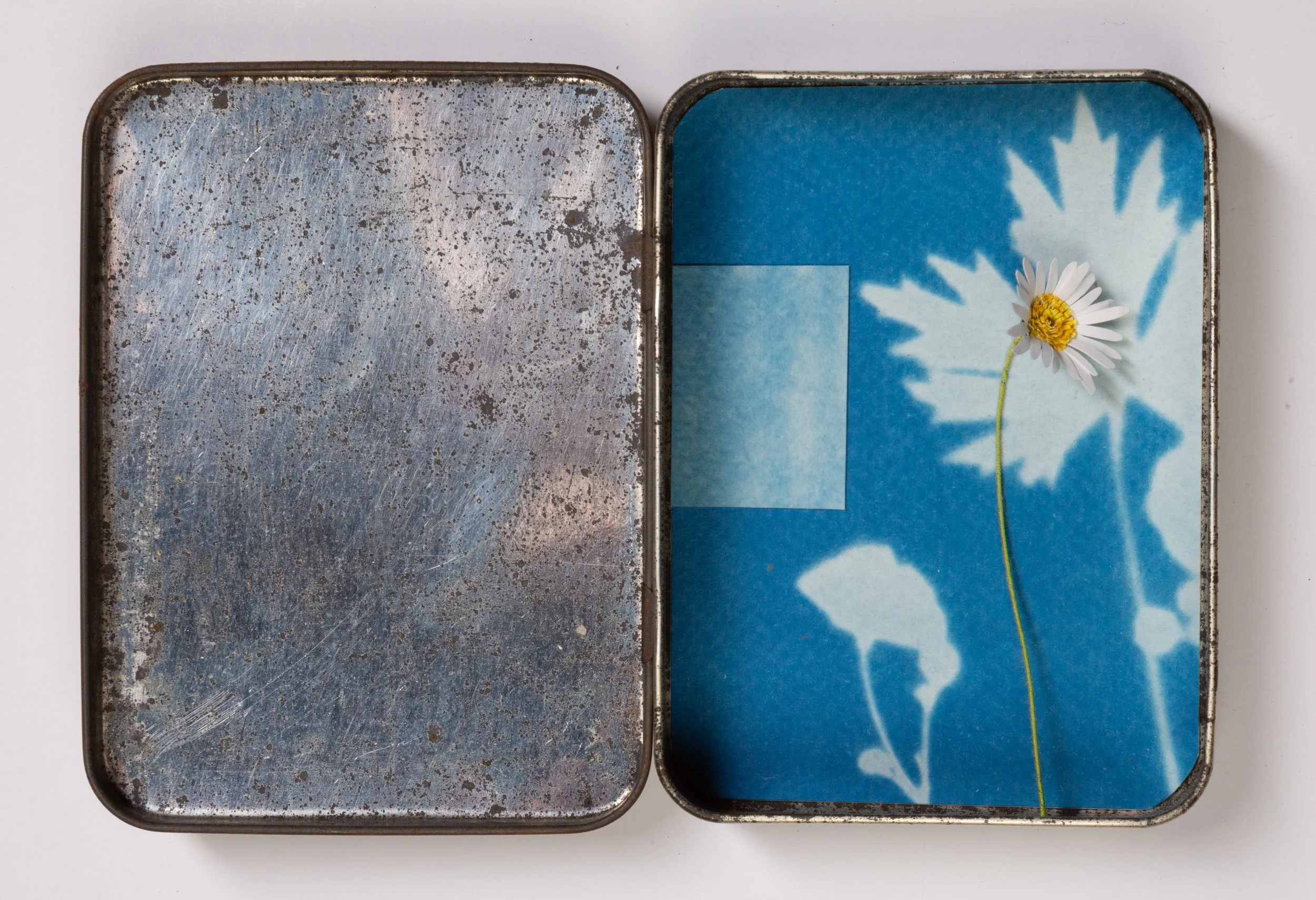 Materials: paper, wire, cyanotype collage and hinged tobacco tin.