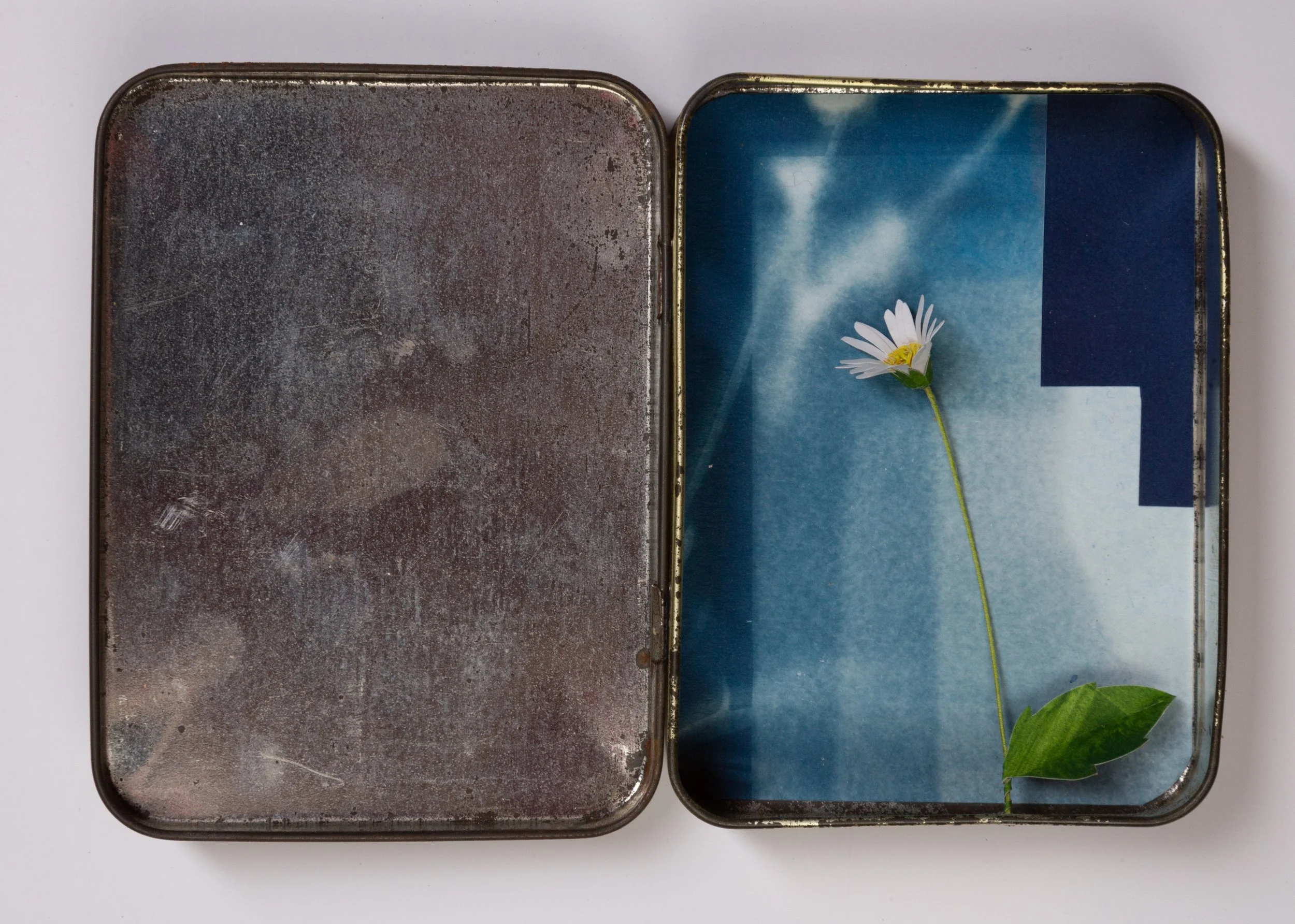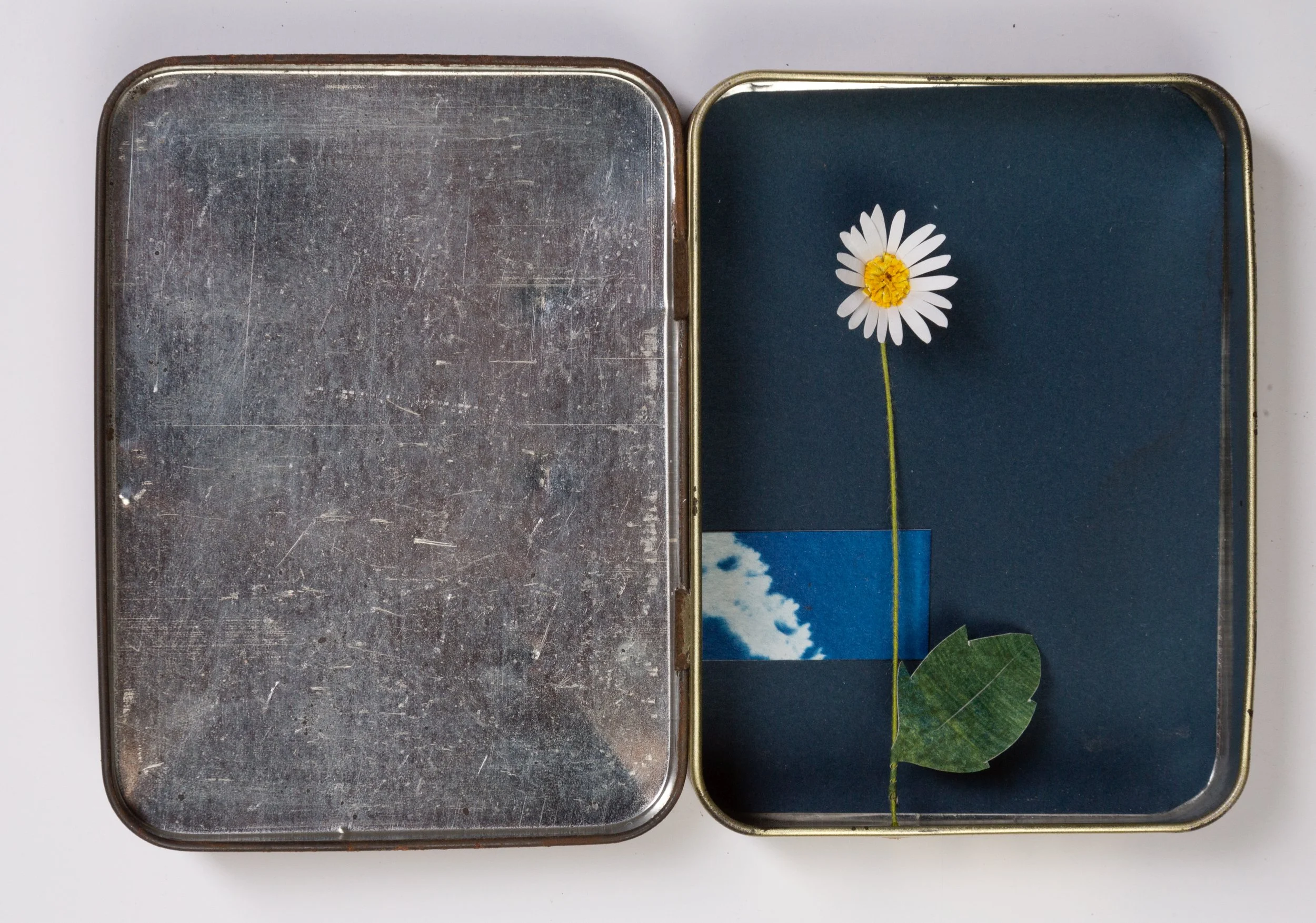 Materials: paper, wire, cyanotype collage and hinged tobacco tin.