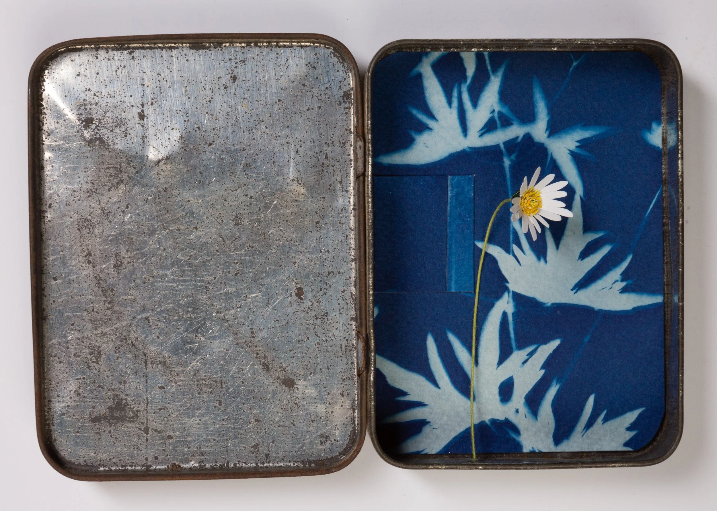 Materials: paper, wire, cyanotype collage and hinged tobacco tin.