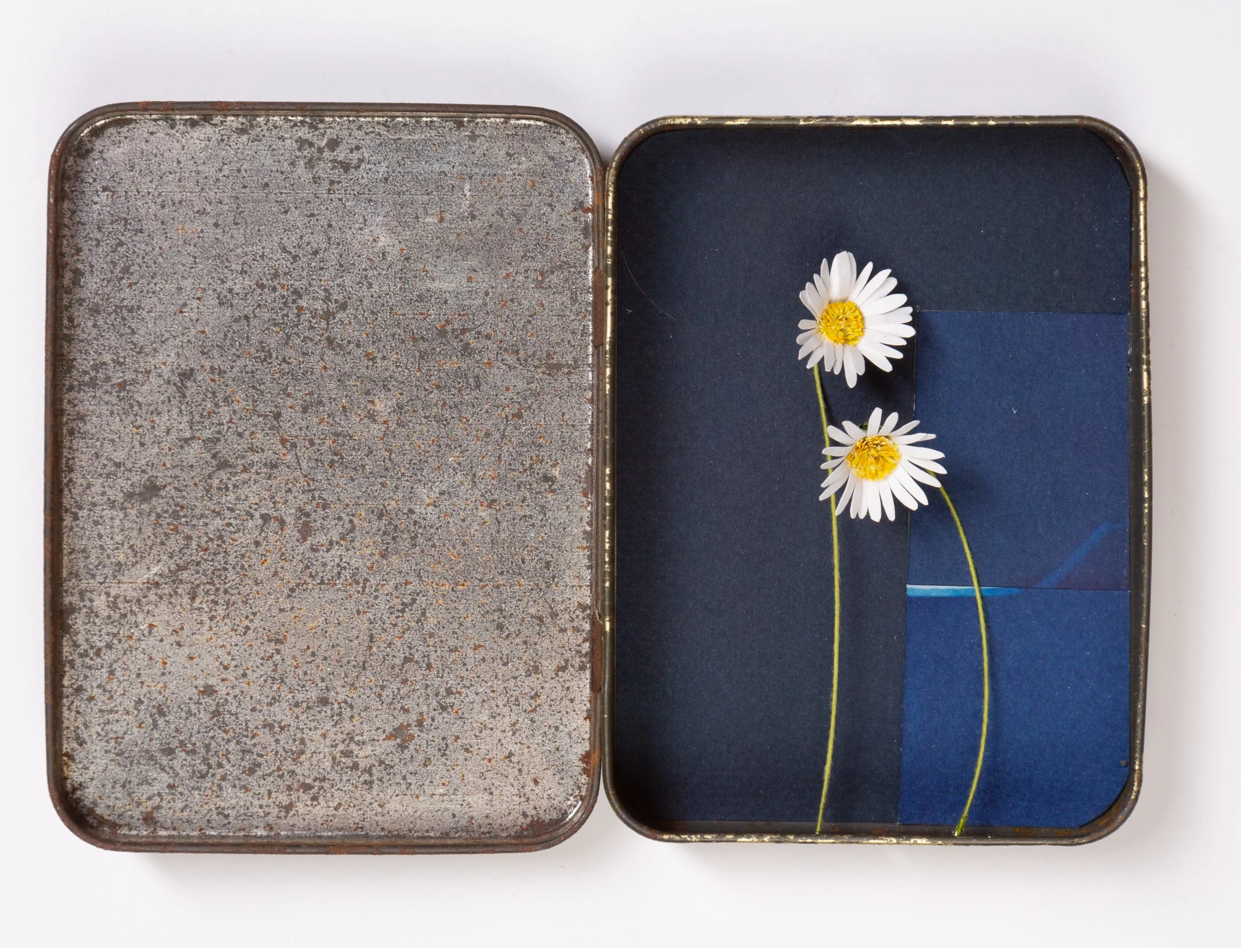Materials: paper, wire, cyanotype collage and hinged tobacco tin.